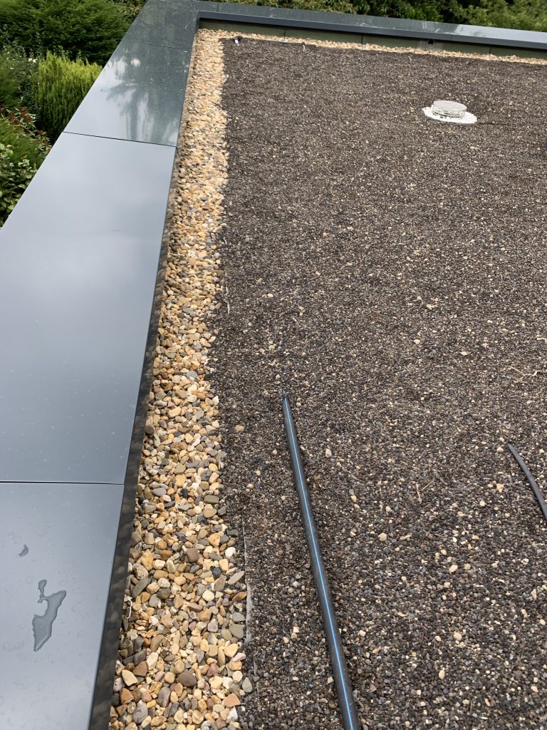 Dachbegrünung im Bau – erkennbar sind zwei der Bewässerungsschläuche (wurden noch mit Substrat überdeckt)
